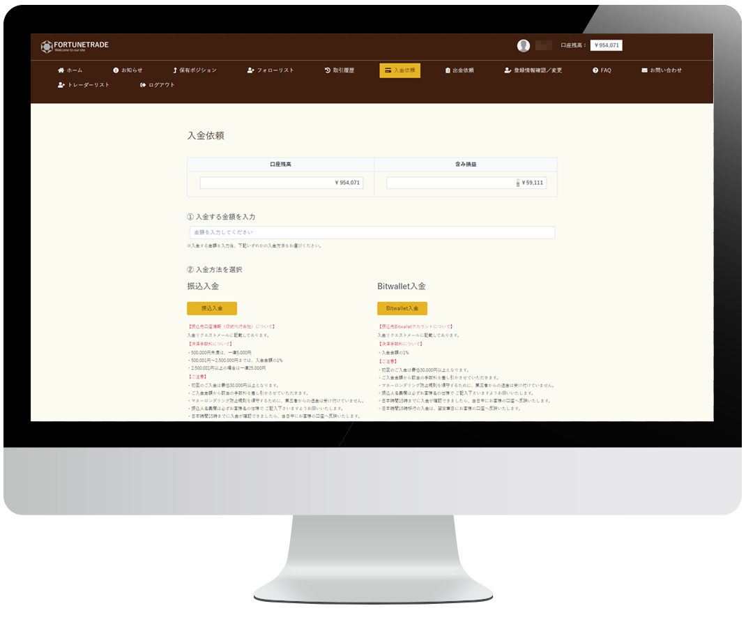 トレードを始める為には、あなたのFortuneTrade口座にデポジットを入金する必要があります。メニューの「入金依頼」にて金額と入金方法をを選択してください。銀行振込、Bitwallet、BTC、USDTがご利用可能です。デポジットが入金され、FortuneTrade上の口座残高に反映されれば準備は完了です。