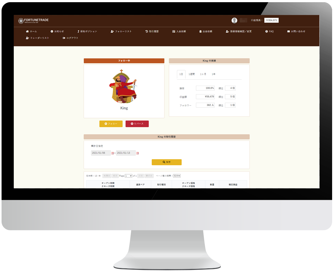 フォローしたトレーダーがトレードを開始すると、あなたも自動で開始となります。トレード状況は「保有ポジション」にてご確認いただけます。同様に、フォローしたトレーダーが保有ポジションを決済すると、あなたのポジションも自動で決済されます。結果は「取引履歴」にてご確認いただけ、あなたのFortuneTrade口座に反映します。収益を獲得したらFortuneTrade口座からお金を引き出してください。「出金依頼」にて金額を指定していただき、ご登録の口座よりお受け取りください。